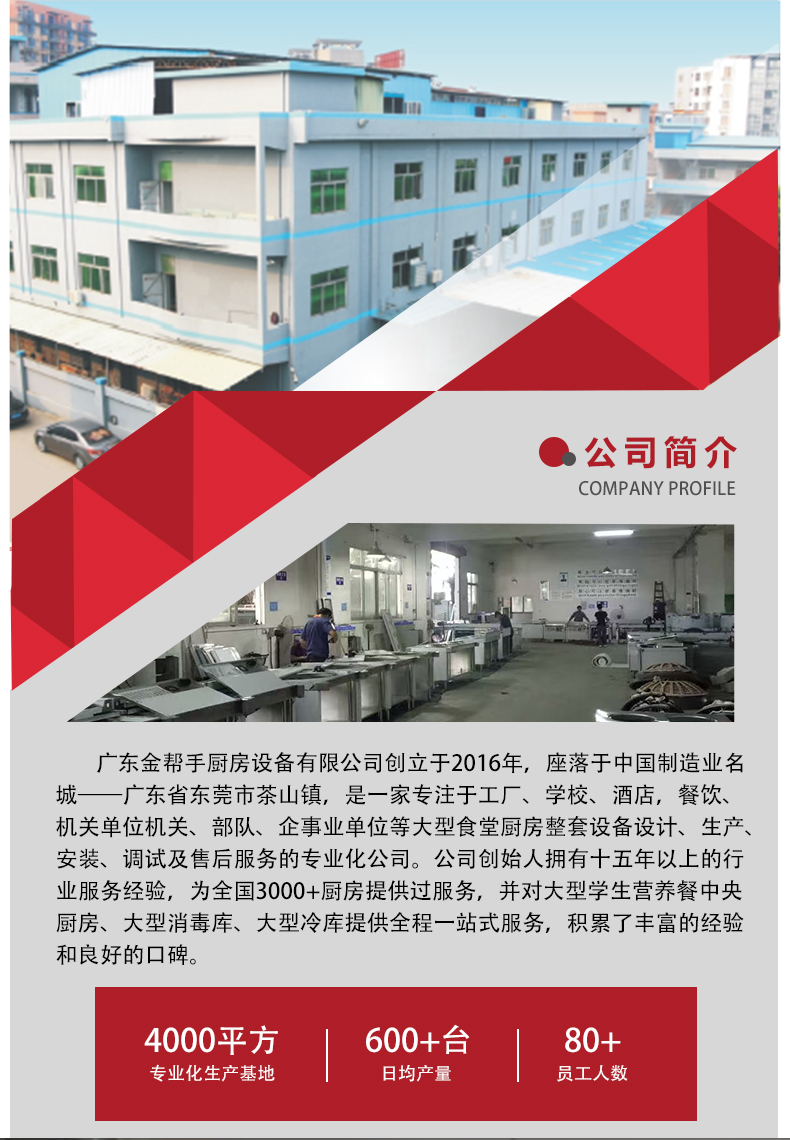 廣(guǎng)東91av廚房設備有限公(gōng)司坐落於(yú)中國製造業名城——廣東省東莞市,是一家專注於工廠(chǎng)、學校、酒店,餐飲、機關單位機關、部隊、企(qǐ)事業單位等大型食堂廚(chú)房整套設備設(shè)計(jì)、生(shēng)產(chǎn)、安裝、調試及售後(hòu)服務的(de)專業化(huà)公司。公司創始人擁有十五年以上的行業服務經驗(yàn),曾為全國上萬家(jiā)廚房設備提供服務,並對(duì)大型(xíng)學生營養餐中央(yāng)廚房、大型消(xiāo)毒庫、大型冷庫提供全程一站式(shì)服務,積累了豐富的經驗和良好的口碑。 如果有需求,可(kě)聯係客服谘詢,免費設計出圖,電話(huà)18688815309